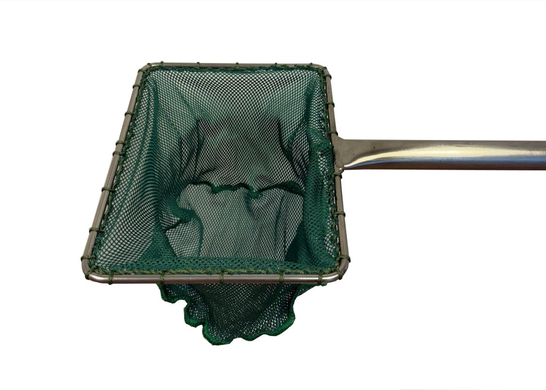 Solid liten håv med skaft sveiset rett på håvrammen. Skaft og håvramme i rustfritt stål 304.