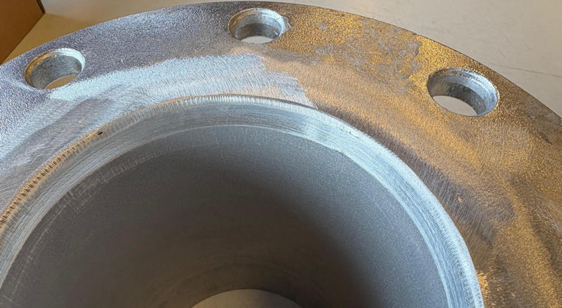 Overgang fra Camlock 6″ Han til DN150 flens. Bearbeidet ift transport av fisk.